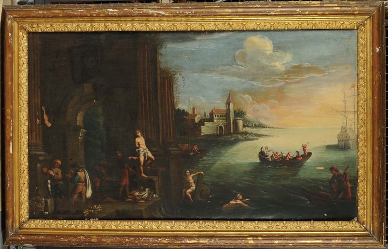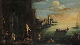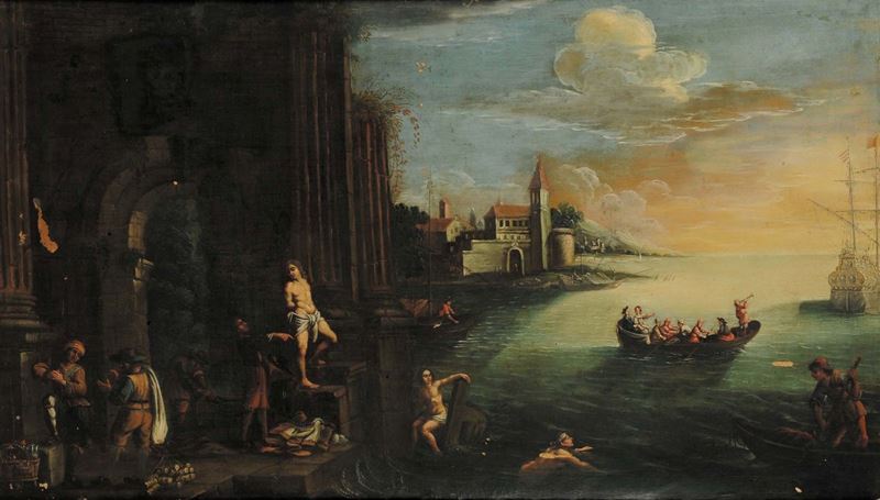 Anonimo del XIX secolo Veduta costiera con personaggi e rovine