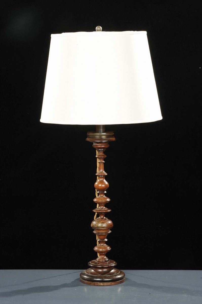 Candeliere in noce tornito trasformato in lampada, XX secolo