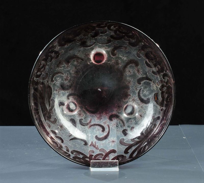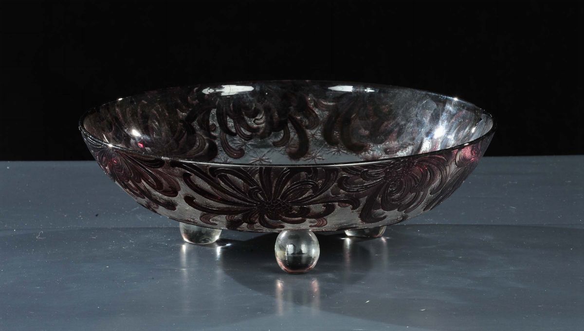 in cristallo inciso poggiante su piedini a sfera, diametro cm 36