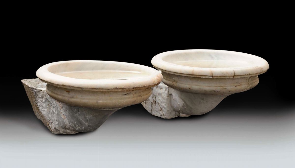 Coppia di acquasantiere in marmo bianco di Carrara, Genova XVI secolo