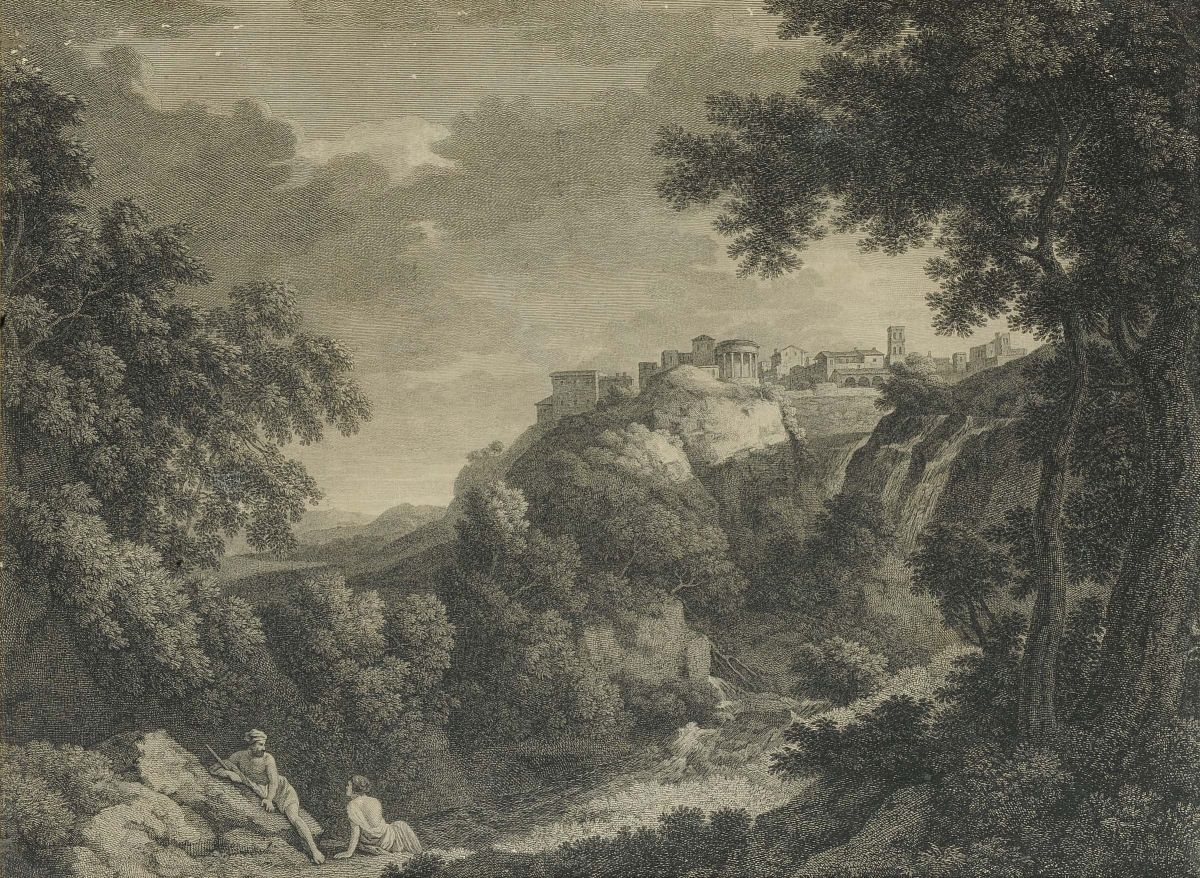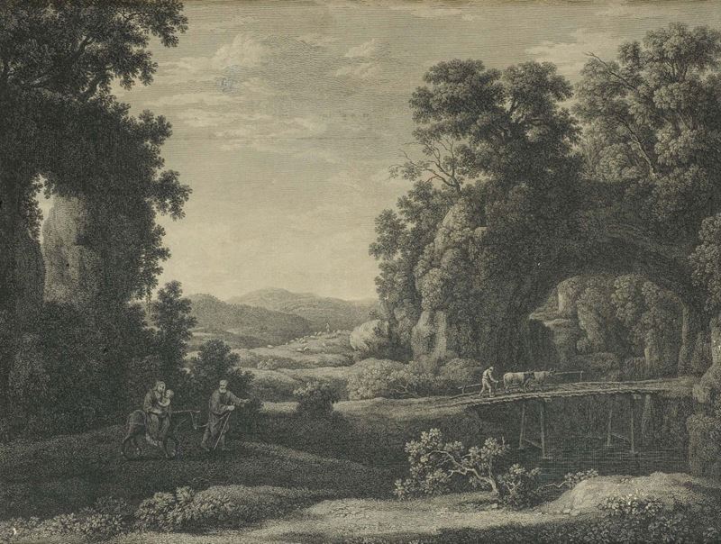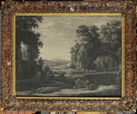 raffiguranti vedute campestri con personaggi, cm 36x47, entro cornici coeve a pastiglia
