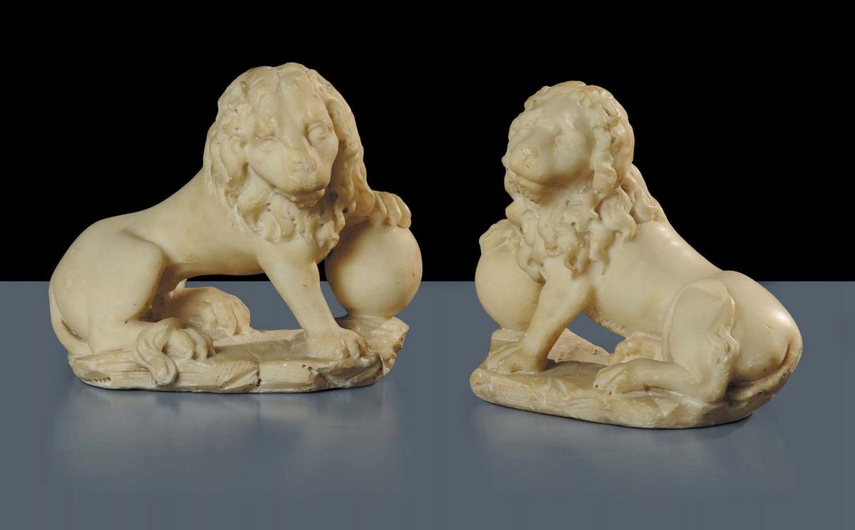 Coppia di sculture in marmo raffiguranti leoni, XVIII secolo
