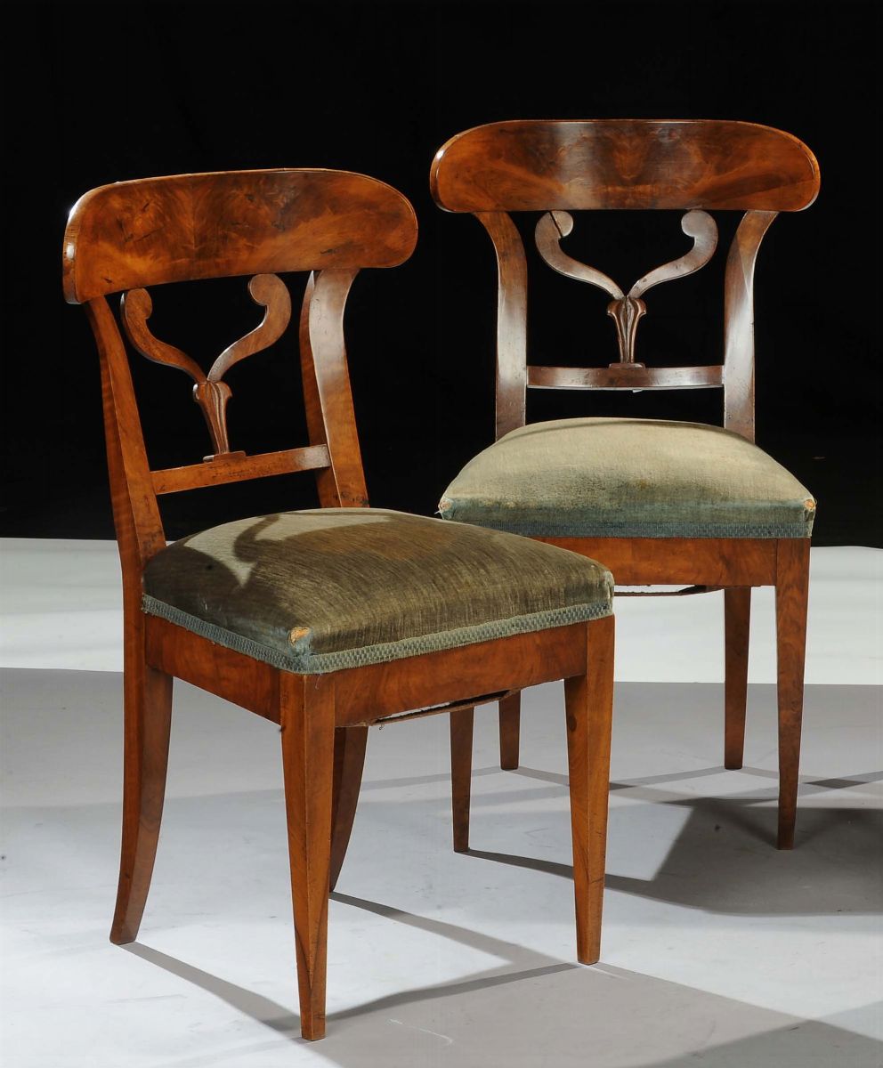 lastronate in legno di noce, gambe troncopiramidali e schienale con volute