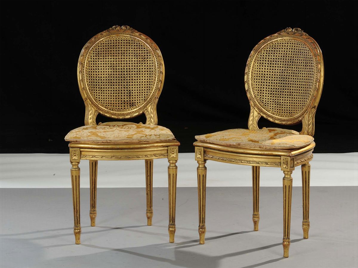 Coppia di sedie in stile Luigi XVI in legno dorato, XX secolo