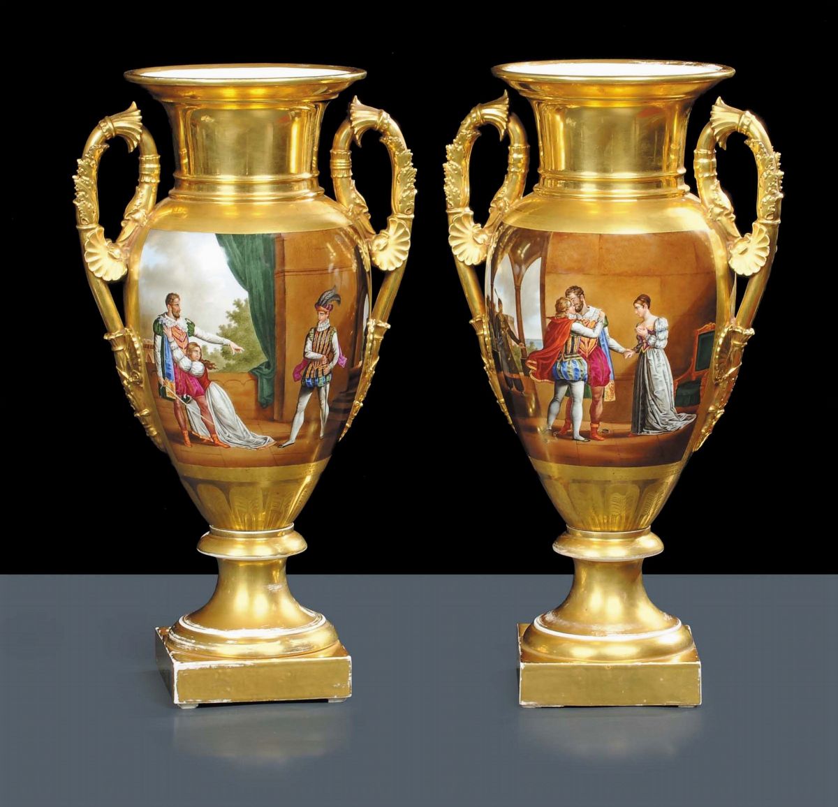 a forma di anfora biansata con collo e bocca svasati, interamente dorati con decoro policromo raffigurante personaggi, base quadrata, altezza cm 52