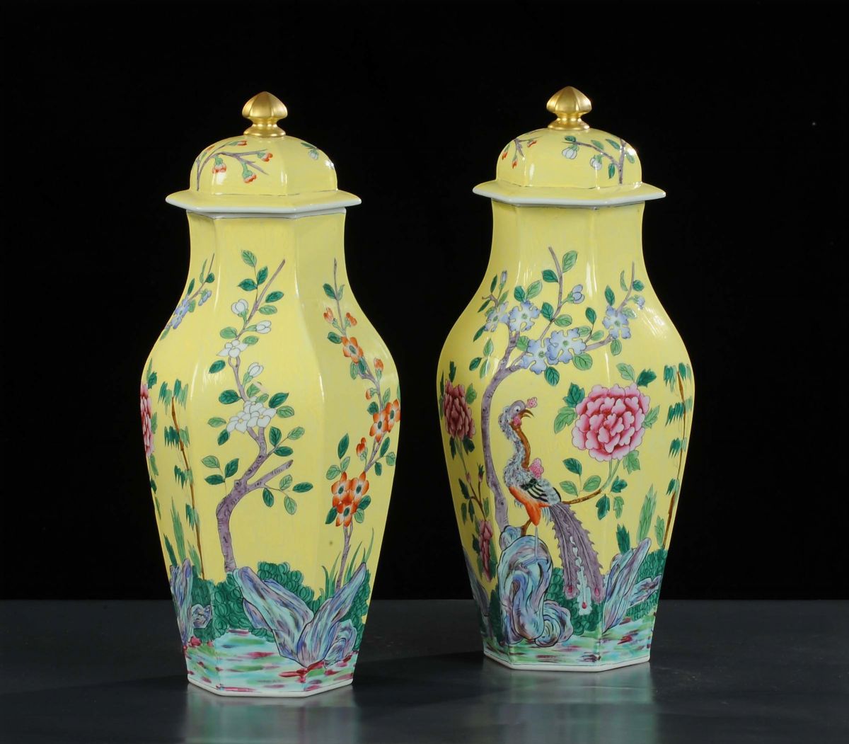 decorati a fondo giallo con piante fiorite e pavone, altezza cm 45