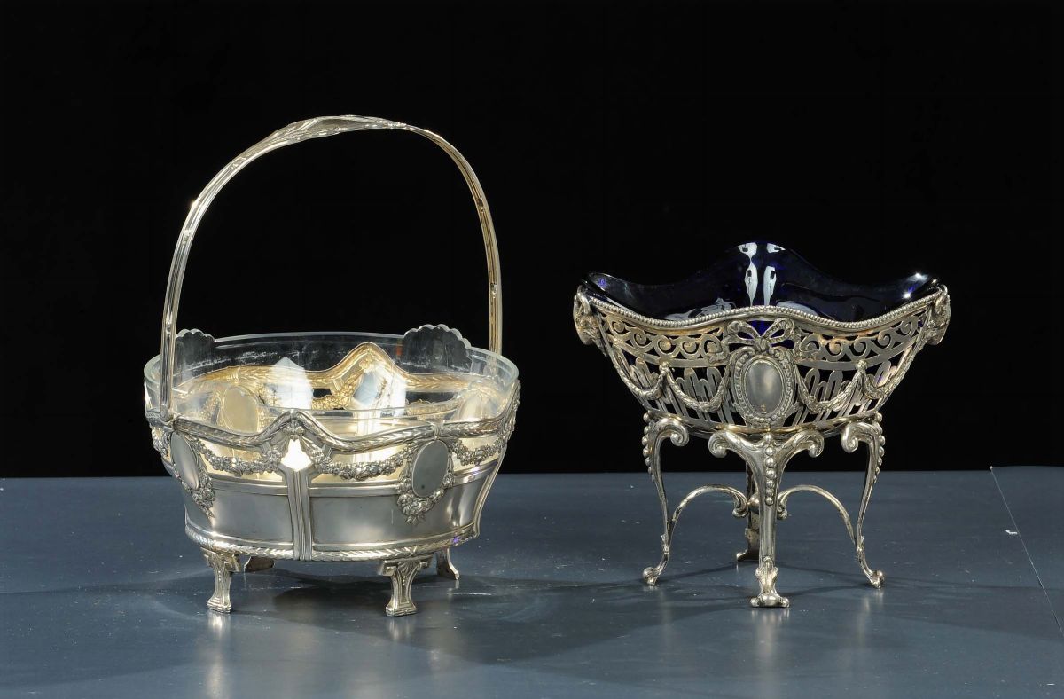 Due centrotavola in metallo argentato, XX secolo
