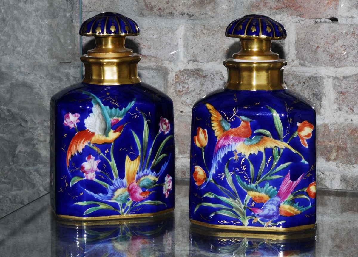 Due flaconi in porcellana policroma a fondo blu, Francia XIX secolo