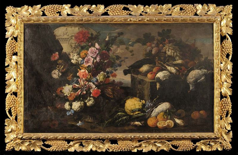 Franz Werner Von Tamm detto Daprait (1658-1724) Natura morta con vaso di fiori, frutta e cacciagioneNatura morta con cocomero, [..]