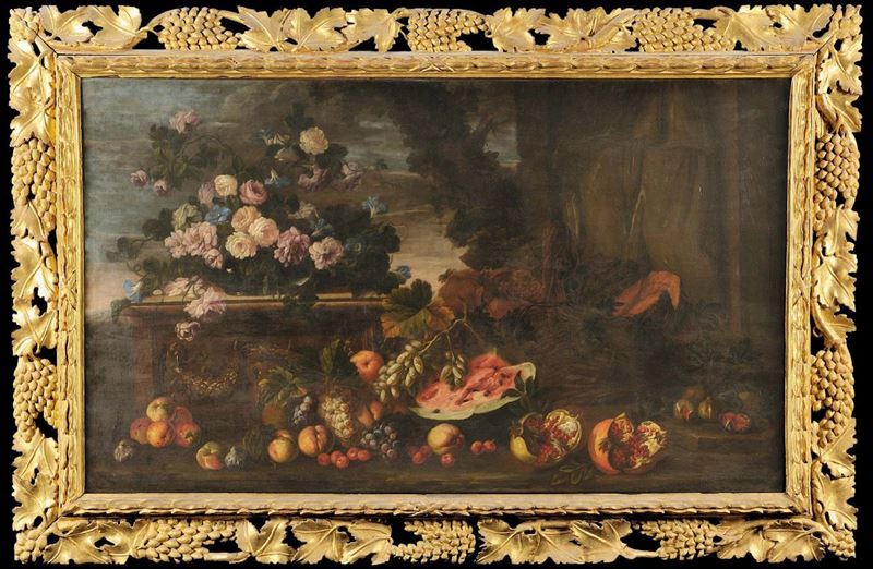 Natura morta con vaso di fiori, frutta e cacciagioneNatura morta con cocomero, melagrane e frutta