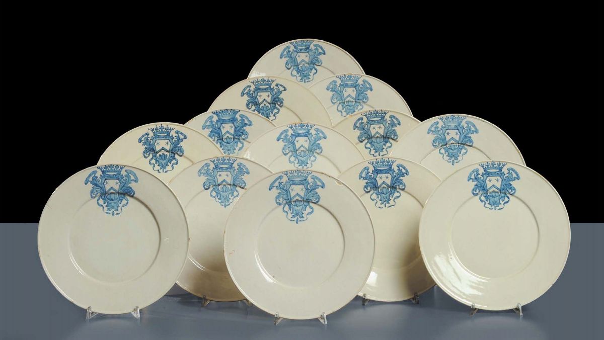 Insieme di tredici piatti in maiolica bianca, Castelli XVIII secolo