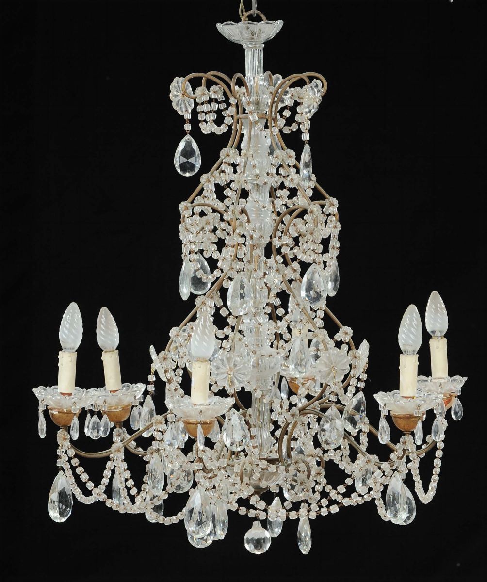 Lampadarietto a sei luci in metallo e cristalli, XX secolo