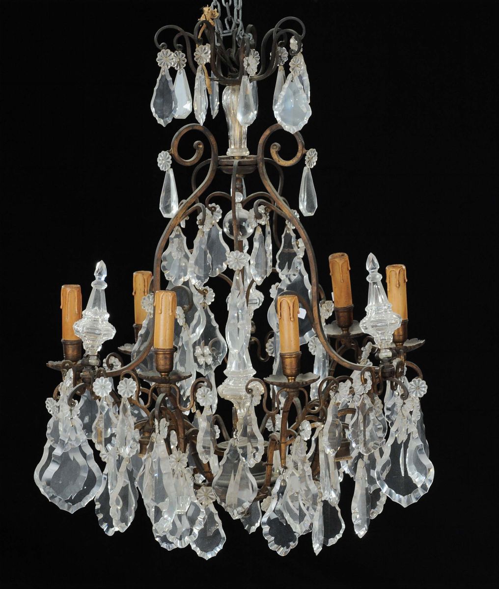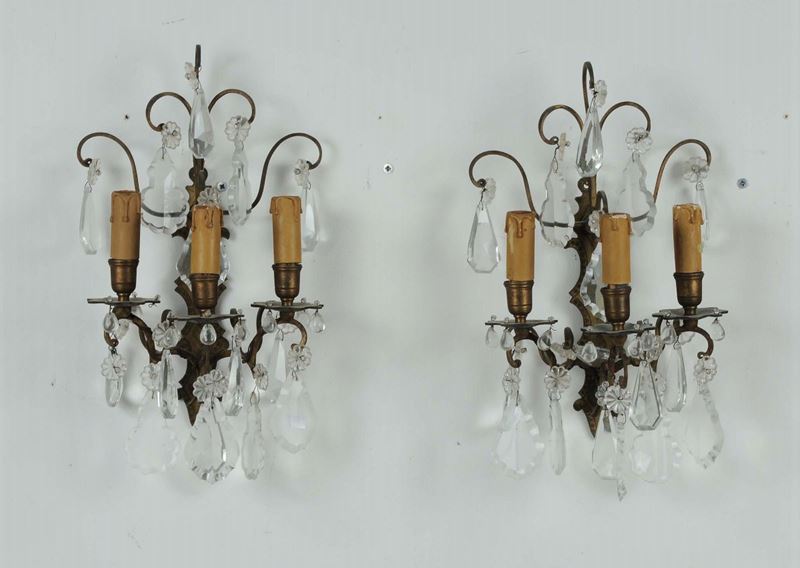 Lampadario a sei luci e coppia di appliques a tre luci, XX secolo