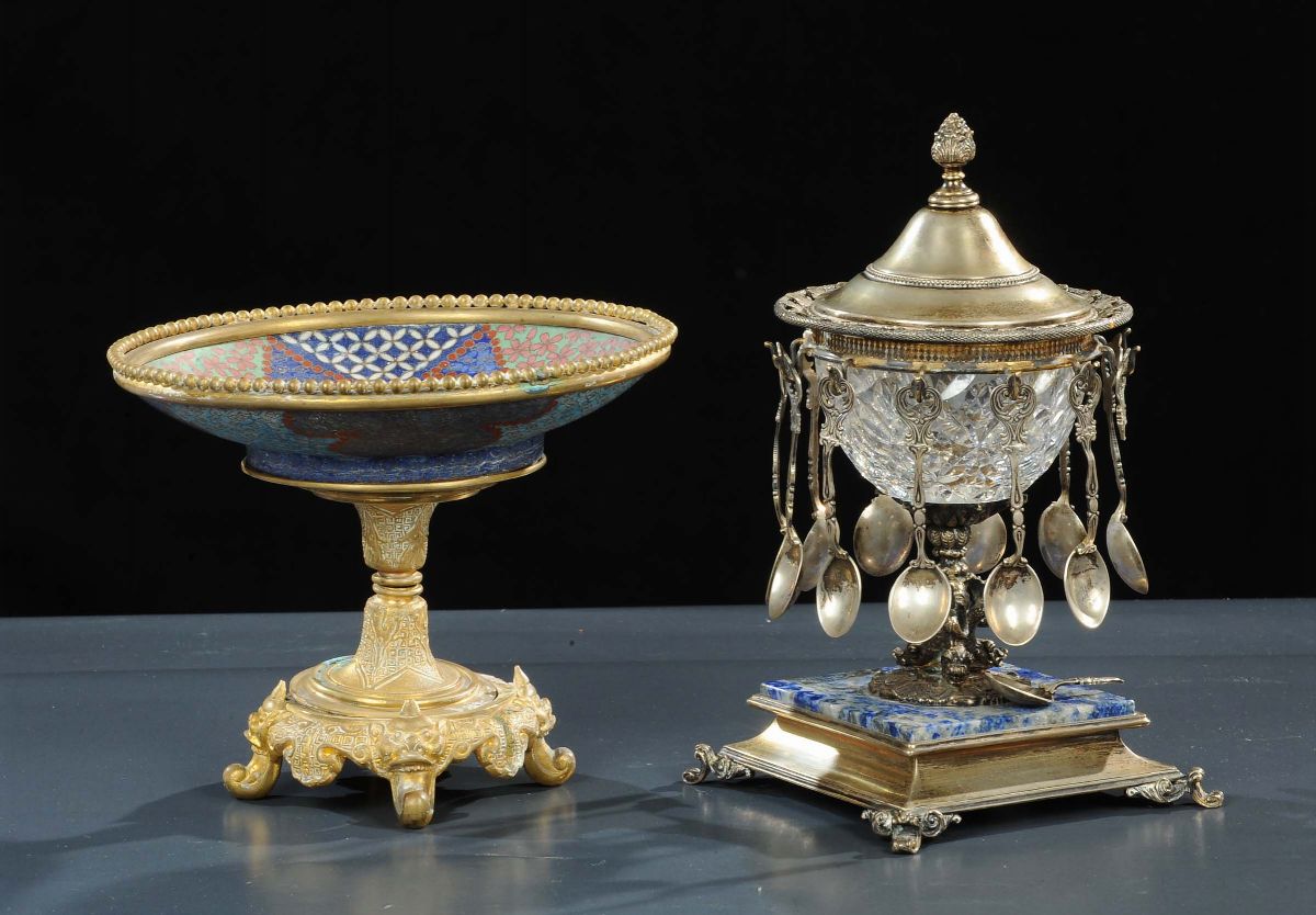 e zuccheriera argentata con coppa in cristallo e cucchiaini