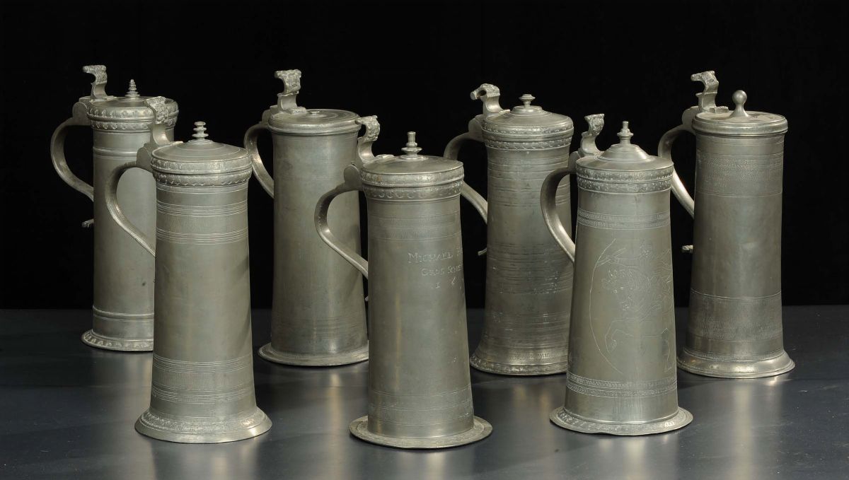 Lotto di sette brocche in peltro