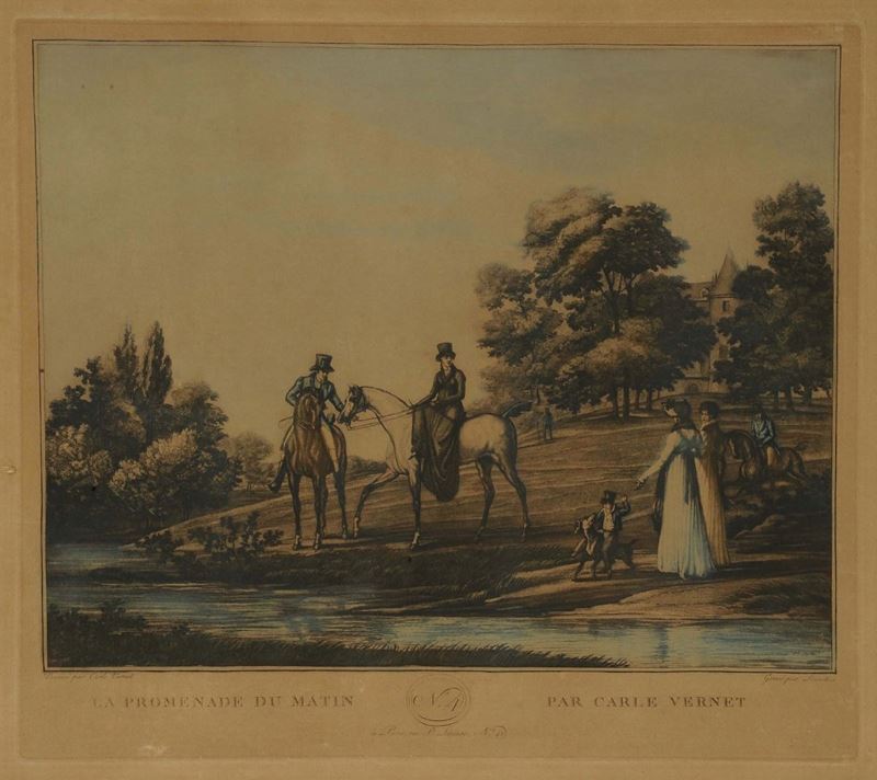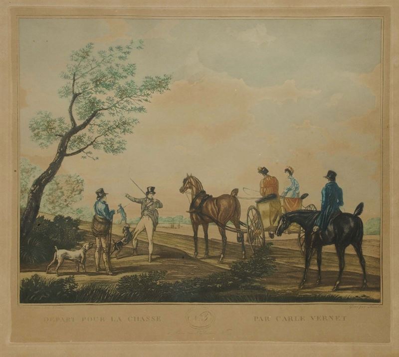 di cui una coppia di stampe a soggetto equestre, cm 48x63 ed una raffigurante paesaggio nordico, cm 74x59