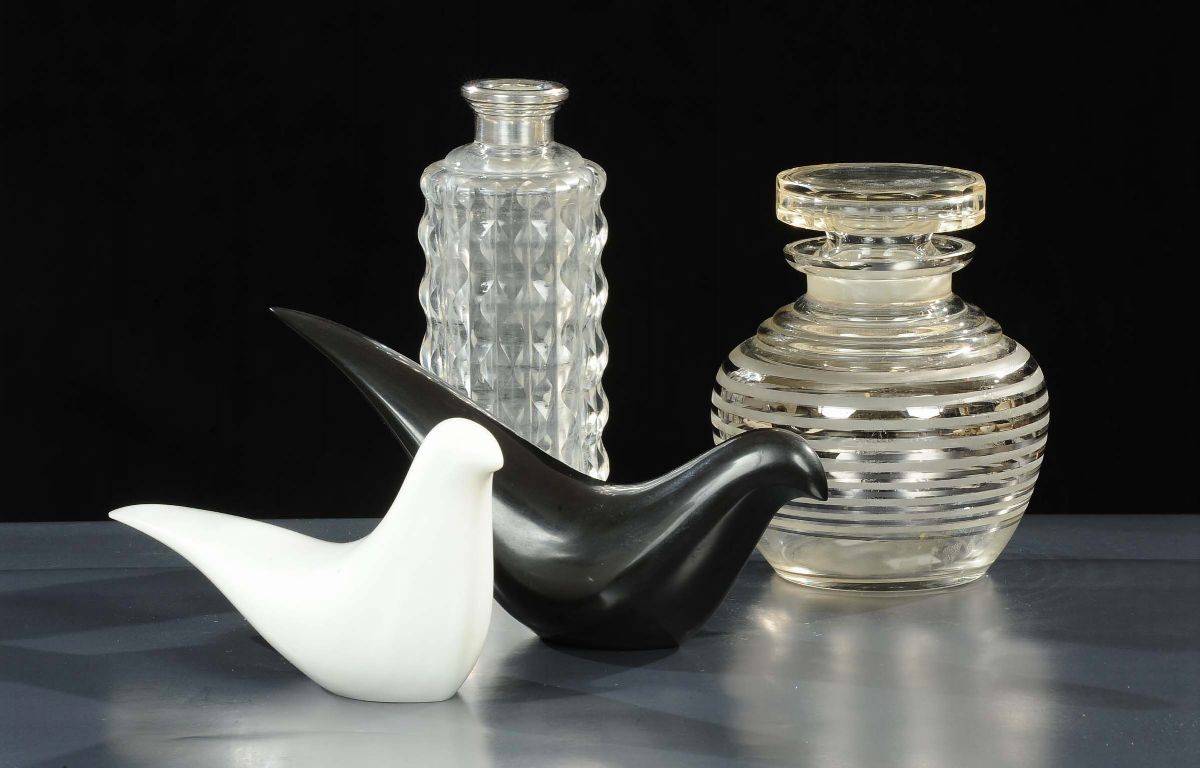 composto da due vasi in vetro e due colombe in marmo