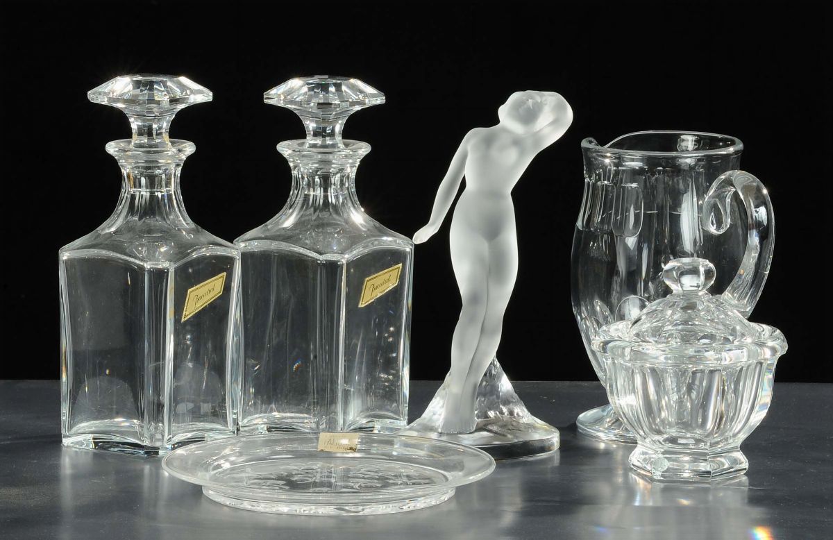 tra cui una coppia di bottiglie Baccarat con tappo, un piattino molato, una zuccheriera ed una brocca