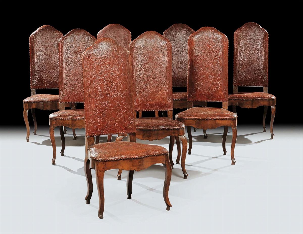 con seduta e schienale rivestiti da cuoio impresso, gambe arcuate
