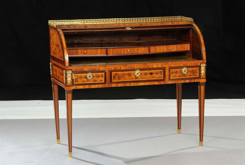 Ribalta a rullo Luigi XVI lastronata ed intarsiata a marqueterie, Francia fine XVIII secolo