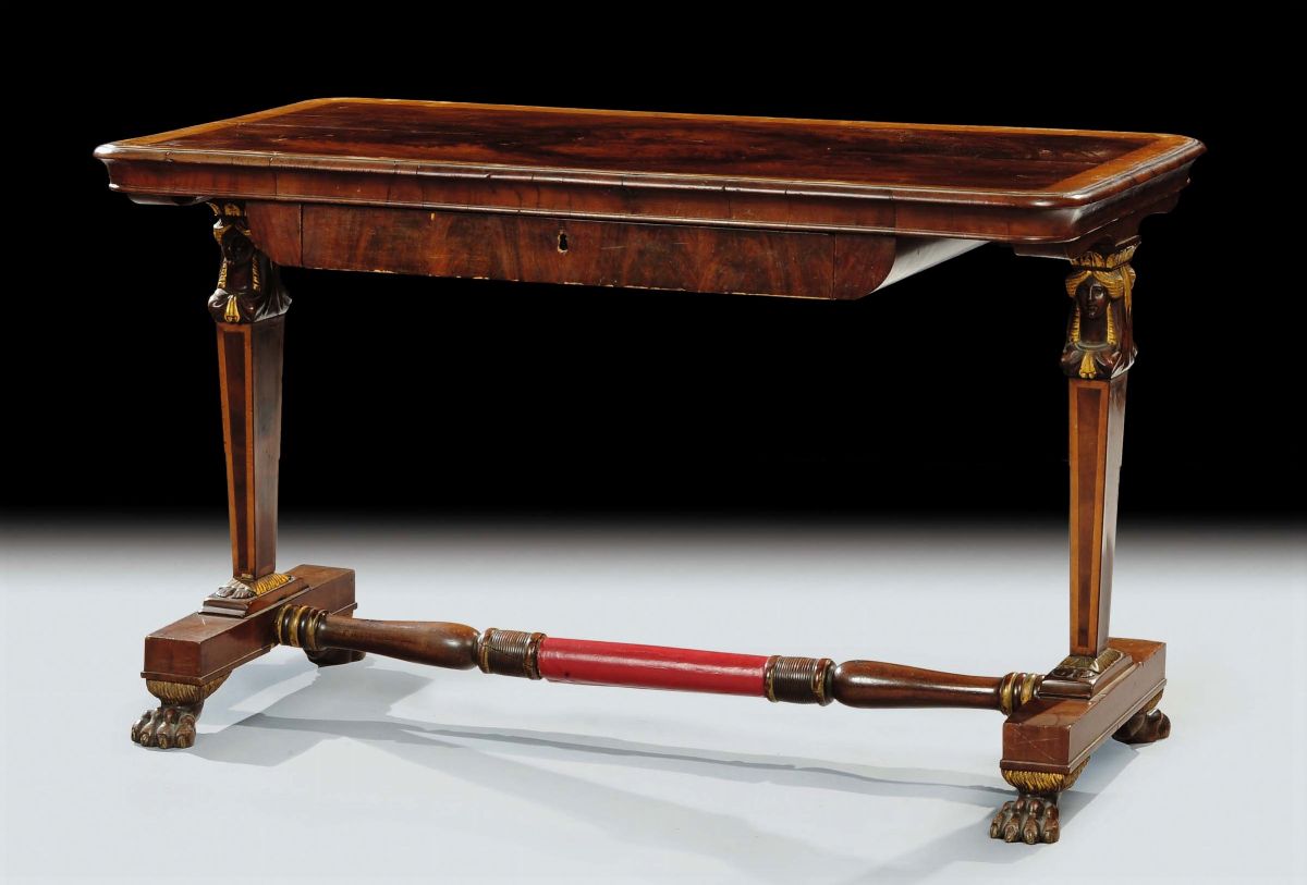 sostegni scolpiti in stile retour dÕEgypte, montanti riuniti da traversa tornita, piedi leonini, un cassetto sul fronte, cm 133x73x81