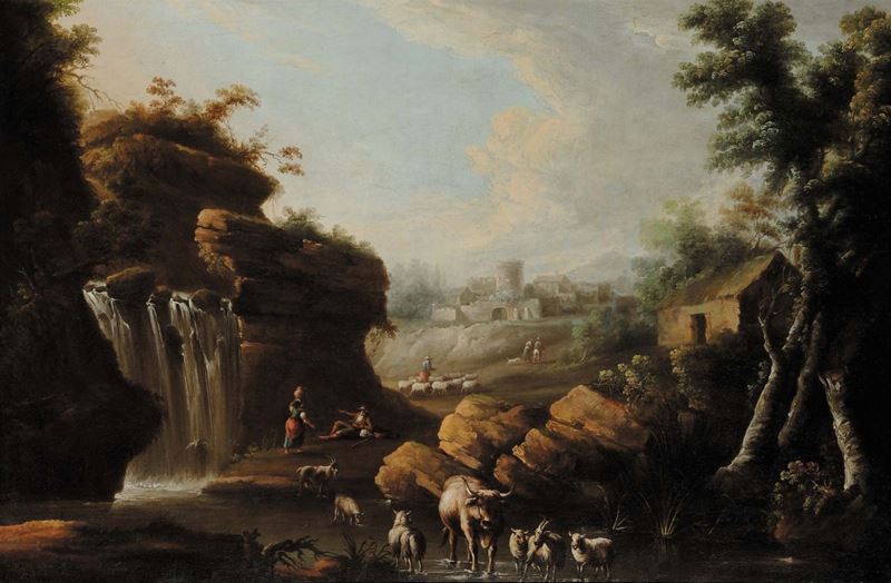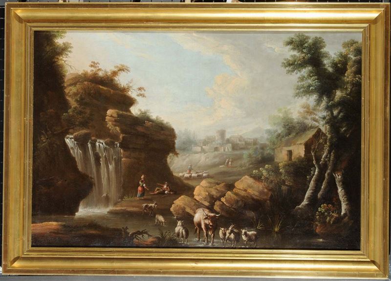 Scuola del XVIII secolo Paesaggio con cascata ed armenti