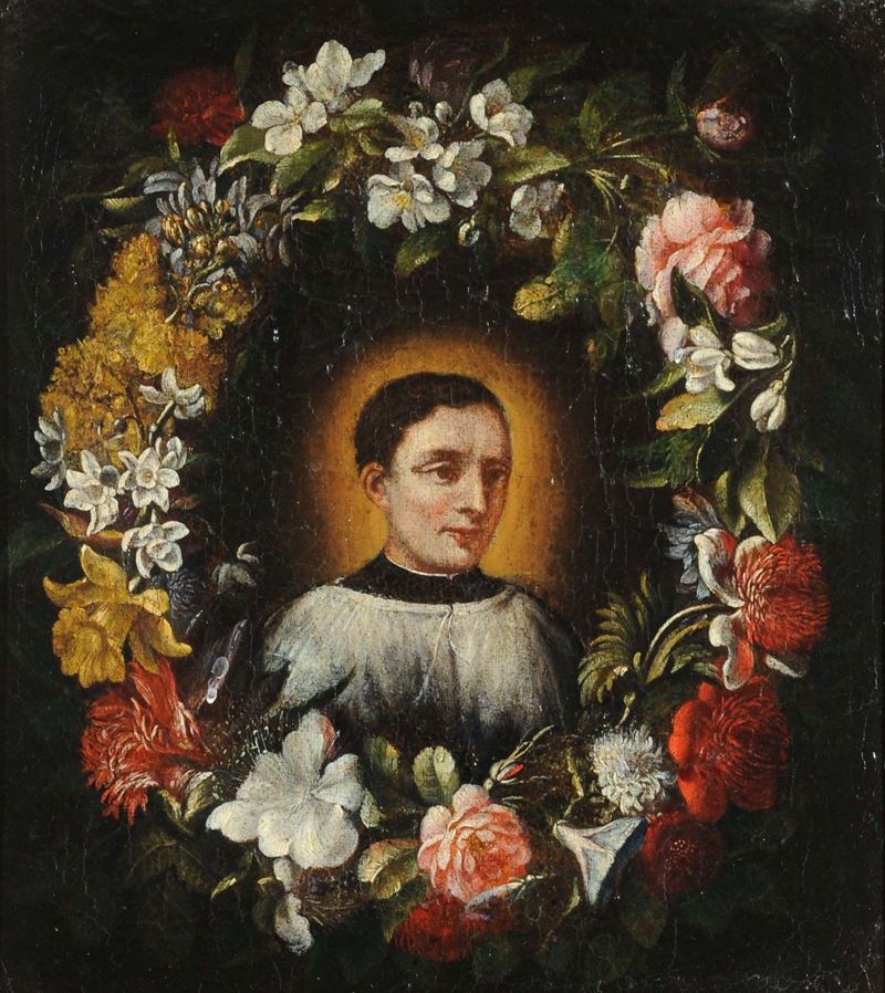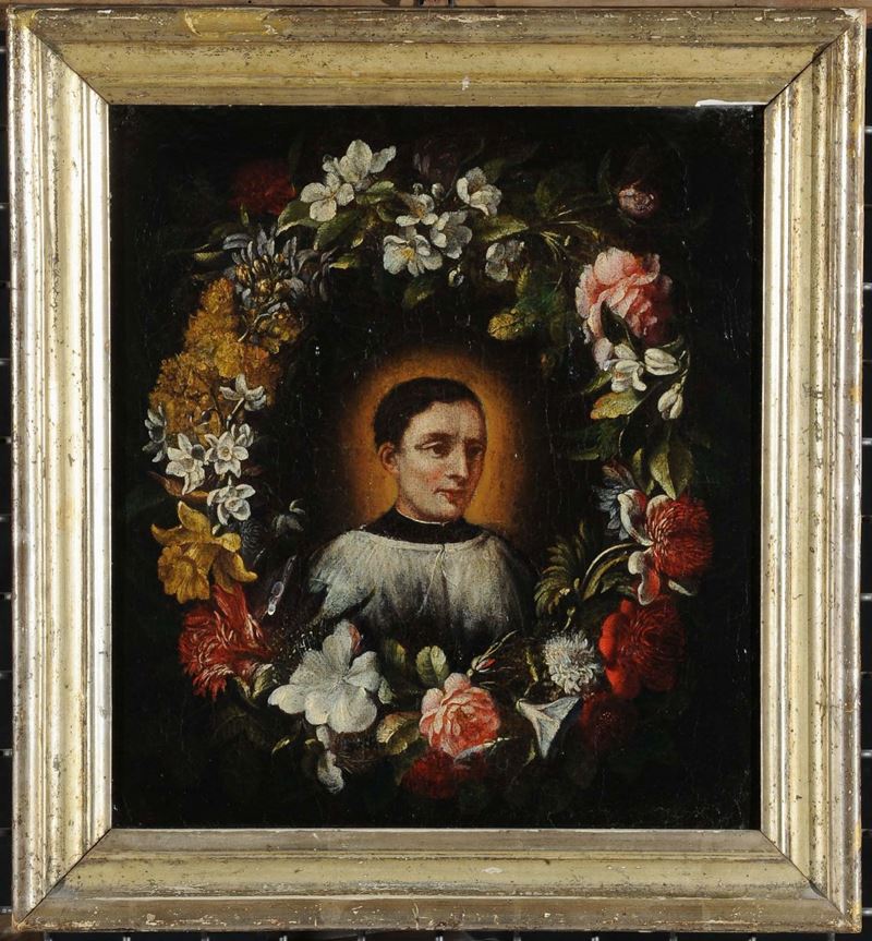 Scuola del XVIII secolo Prelato con ghirlanda di fiori