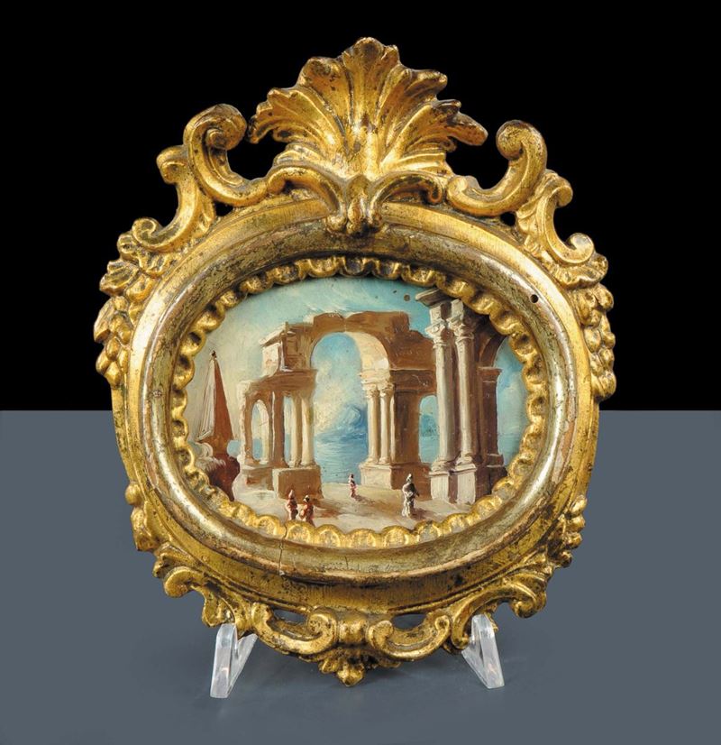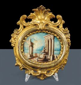 coppia di dipinti ad olio su rame, cm 8x10,5, entro cornici in legno intagliato a volute e dorato