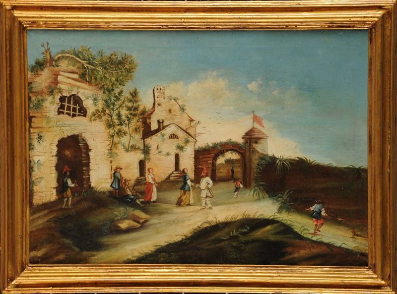 Scuola Veneta del XIX secolo Capriccio con figure in maschera