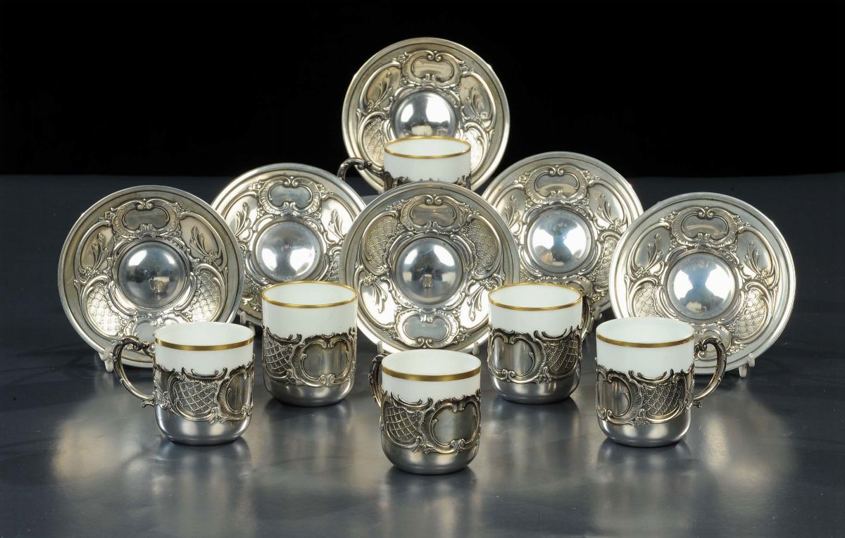 Sei tazzine da caff in ceramica e argento, Richard Ginori, Pittoria di Doccia