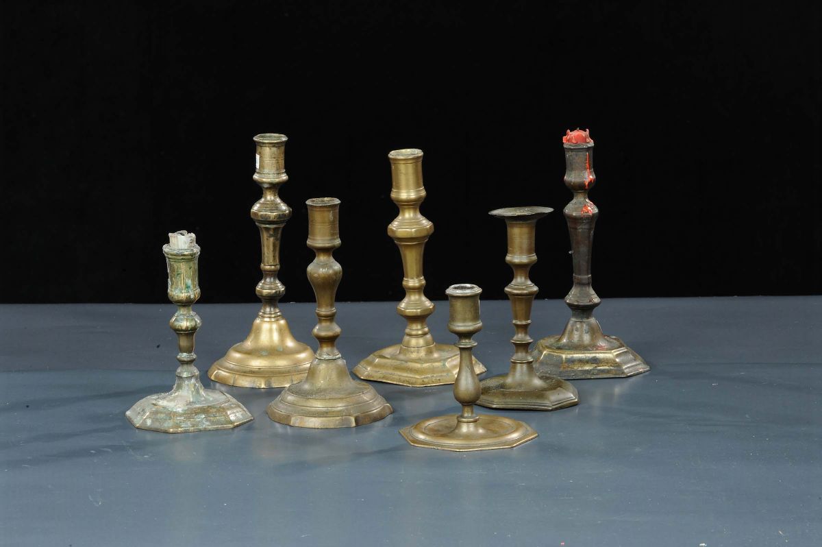Sette candelabri differenti in bronzo brunito e dorato, XVIII secolo