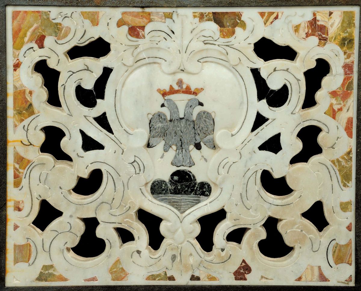 applicazioni in marmi policromi e riserva centrale con raffigurazione di aquila bicipite sormontata da corona, cm 62x76