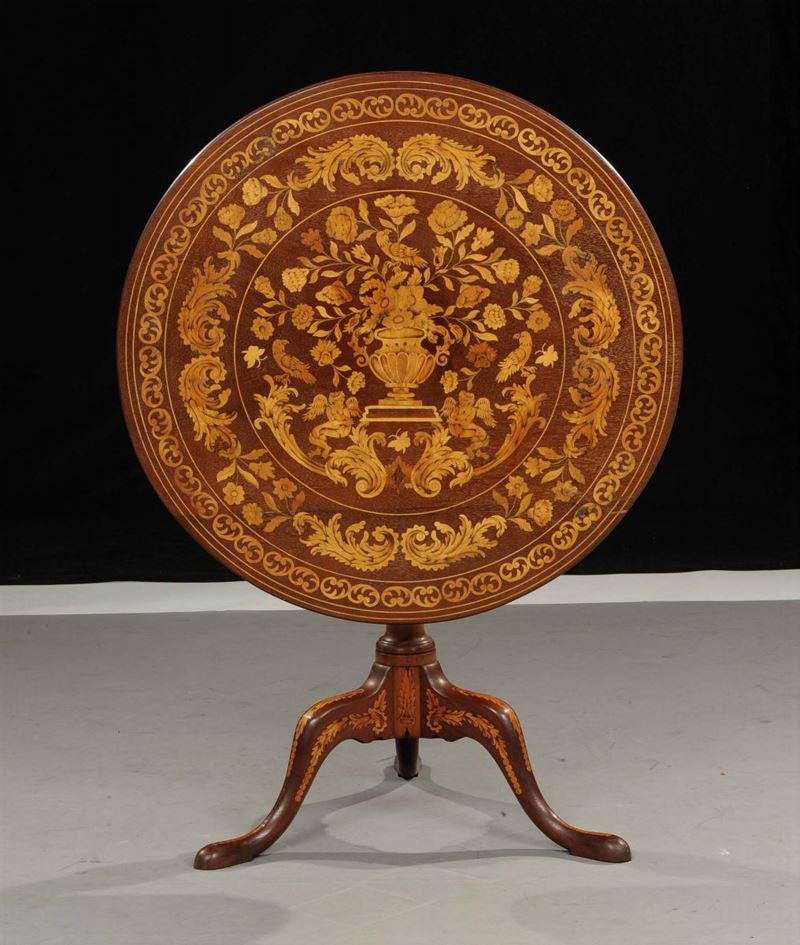 decoro floreale concentrico, fusto centrale poggiante su tre gambe arcuate, diametro cm 84, altezza cm 72