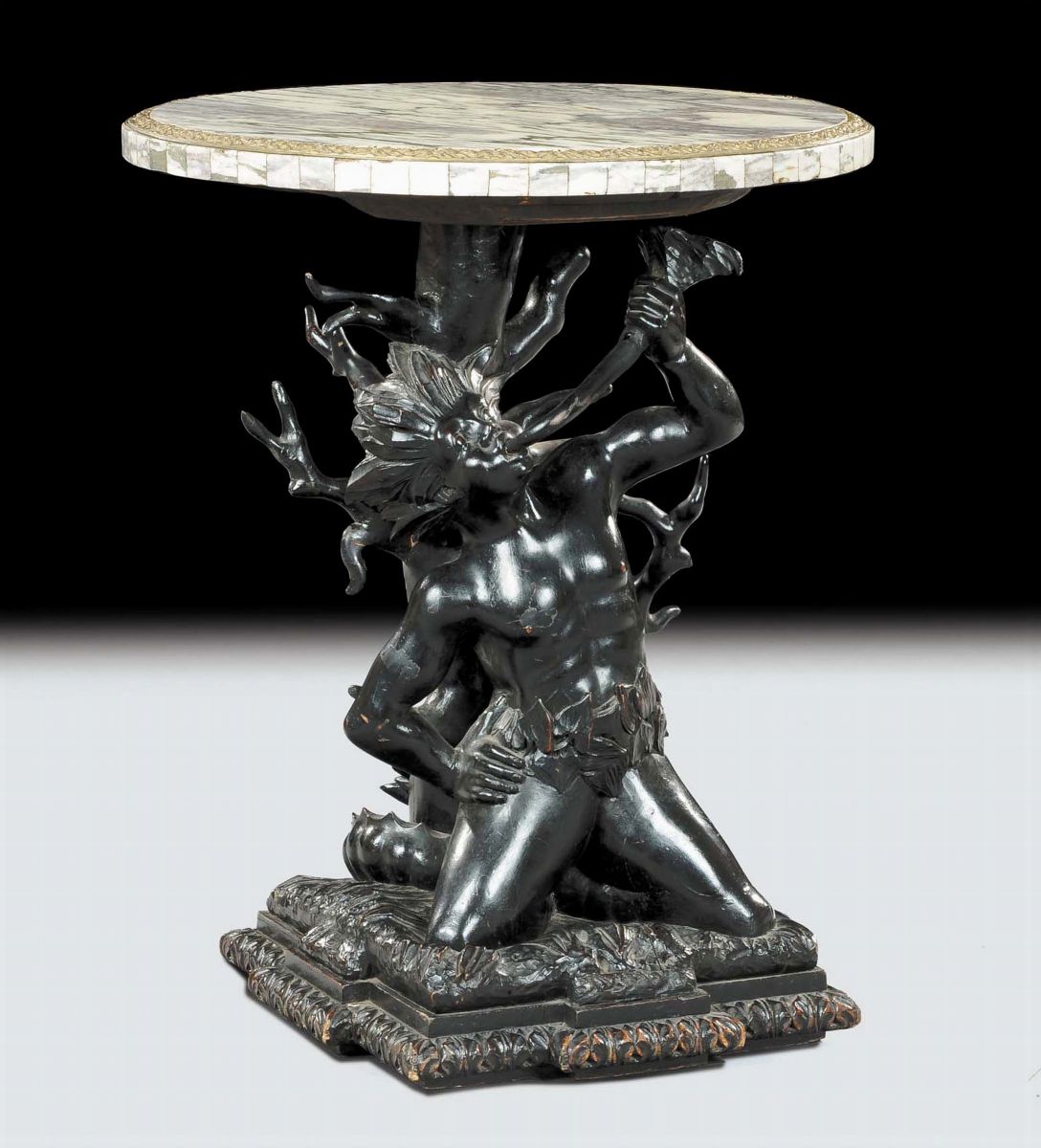 fusto intagliato con figura maschile che appoggia su albero, piano circolare in marmo con venature grigie lastronato, altezza cm 90, diametro cm 74 (difetti)