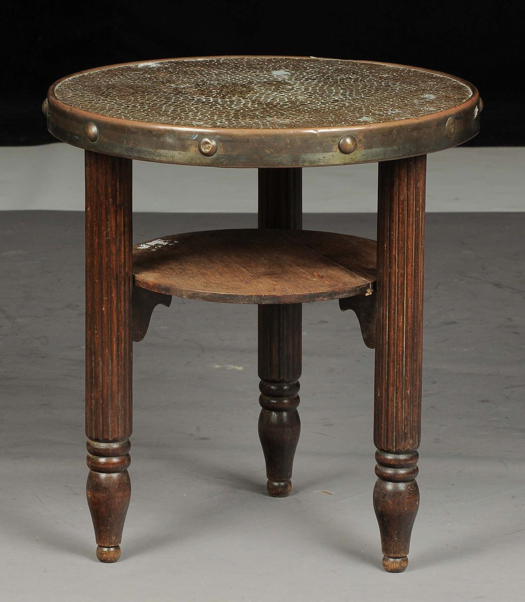 Tavolo rotondo con piano in metallo e struttura in noce