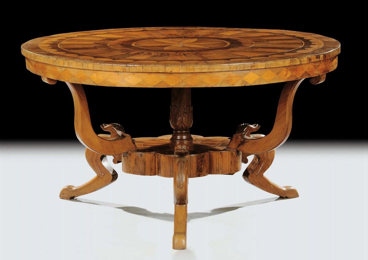 Tavolo rotondo intarsiato in essenze diverse, Veneto metˆ del XIX secolo