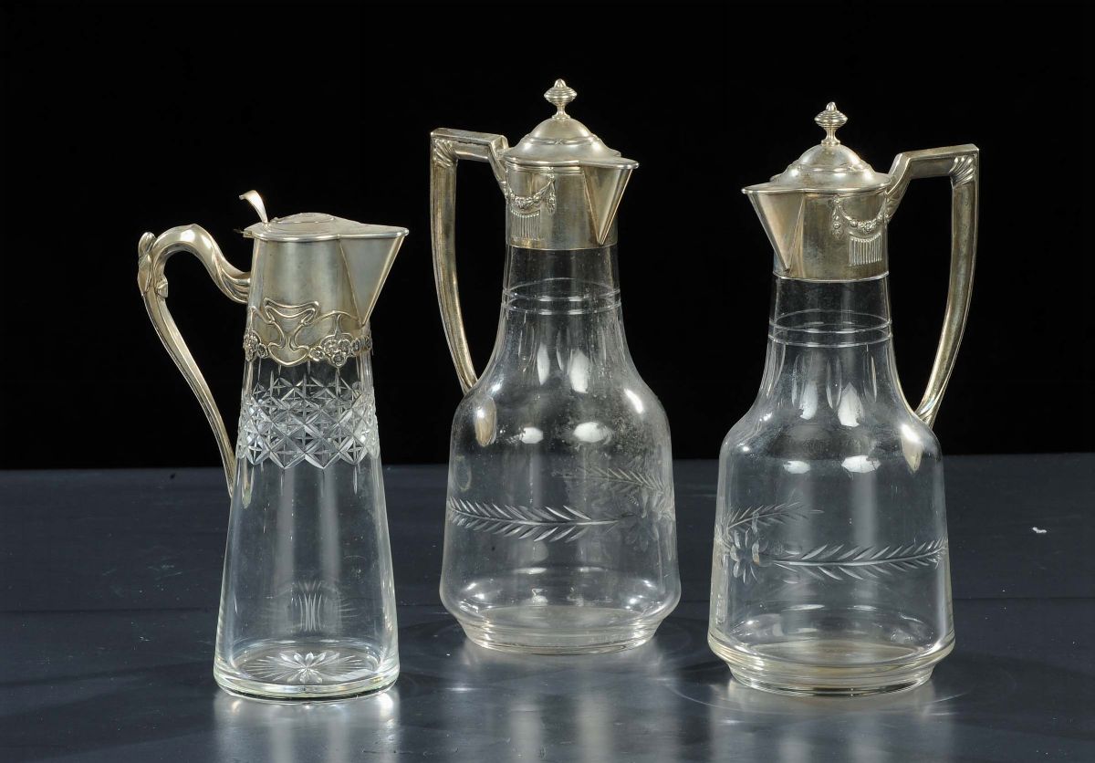 Tre brocche in argento e cristallo di cui una coppia, epoca Liberty