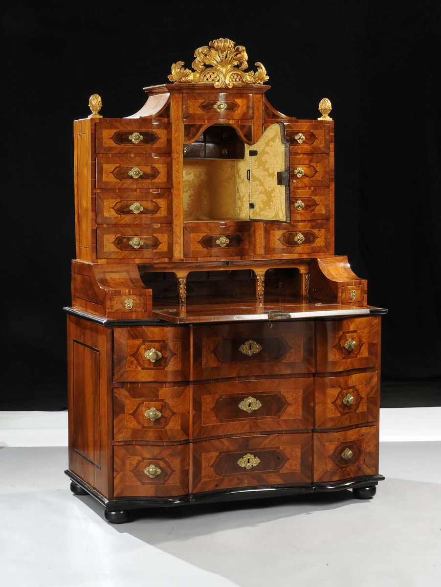 tre cassetti sul fronte mosso a profilo mistilineo e profili ebanizzati, alzata con due colonne di cassetti a serratura laterali ed anta centrale bombata, calatoia che cela scrittoio e cassettini, cimasa centrale dorata, intagliata e traforata a volute e foglie d'acanto, pigne dorate sui montanti, cm 131x71x207