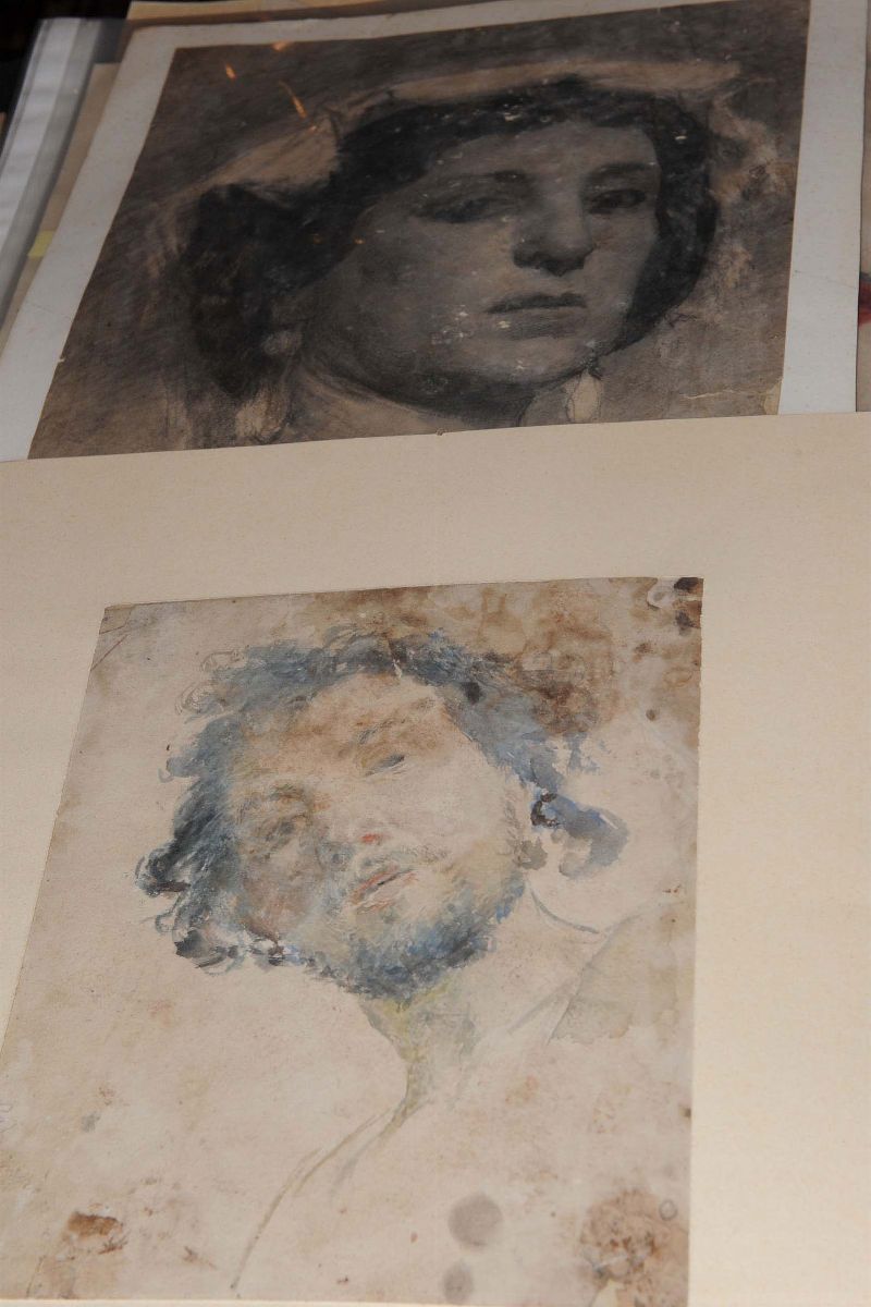 bozzetto a matita ed acquarello su carta raffigurante testa maschile, cm 25x21, firma in basso a sinistra, e bozzetto a matita su carta raffigurante testa femminile, cm 38x28