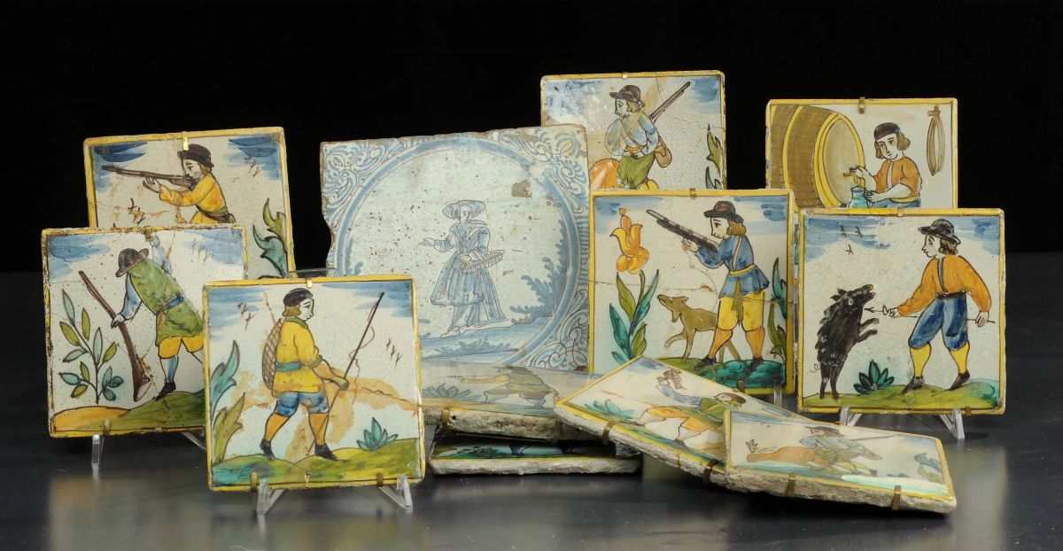 Undici mattonelle con figure decorate in policromia, XIX secolo
