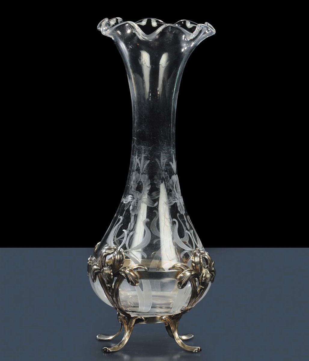 con decoro di orchidee. Sostegno in argento sterling sbalzato con motivo simile a quello del vaso. Punzoni nellÕargento