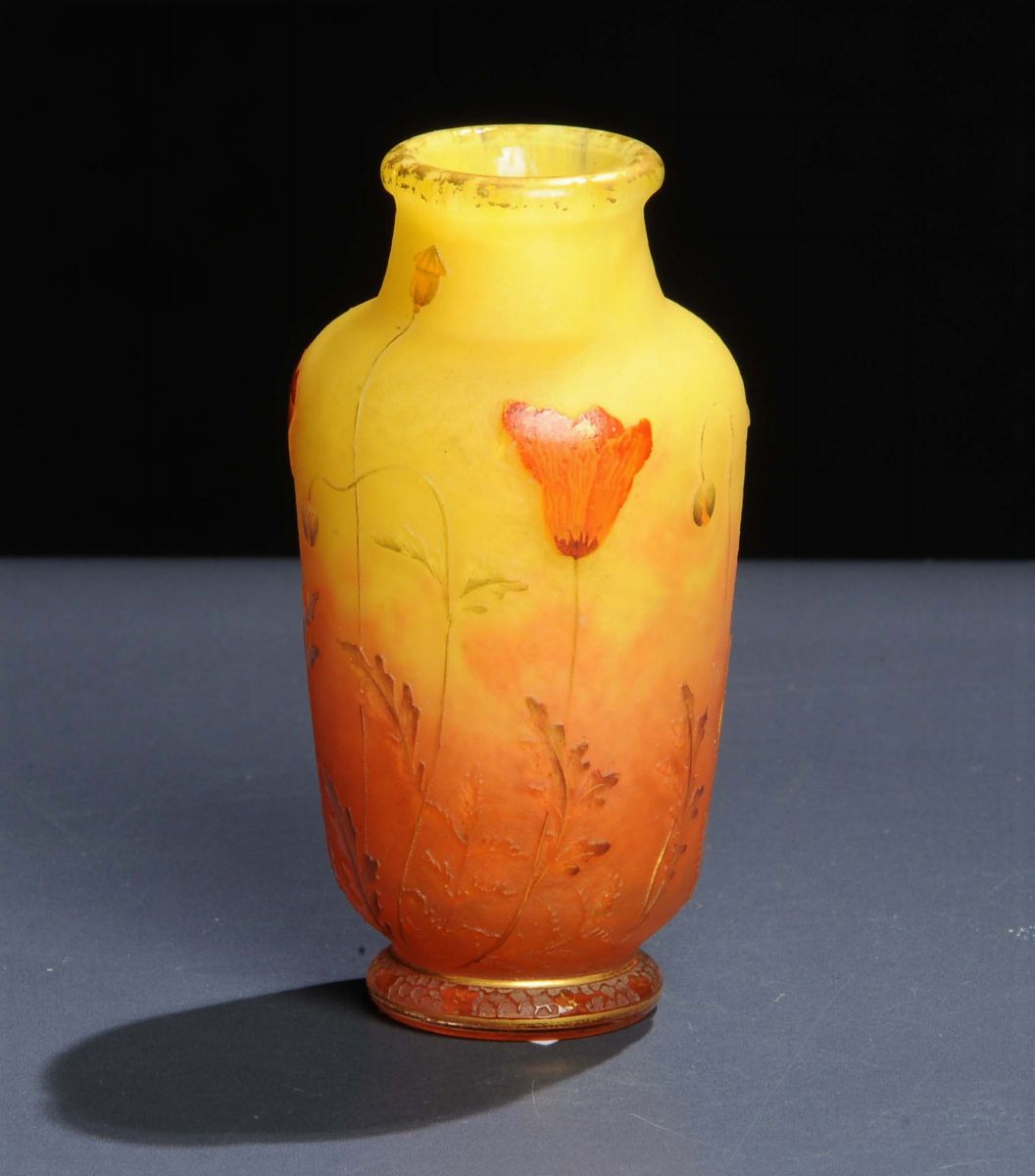 con inclusione di polveri vitree gialla e arancio, lavorato all'acido, decorato con papaveri e rifinito in oro. Firma in oro sotto la base. 1910 circa, altezza cm 9