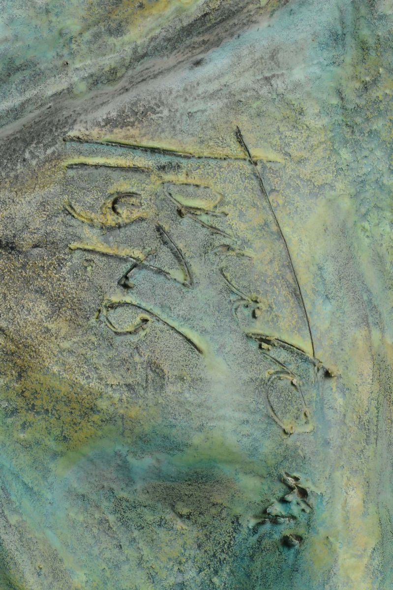 terracotta modellata entro stampo con interventi manuali. Smalti nelle tonalitˆ del grigio verde. Firma e data 76 incise sul reto. Cm 79x60x15