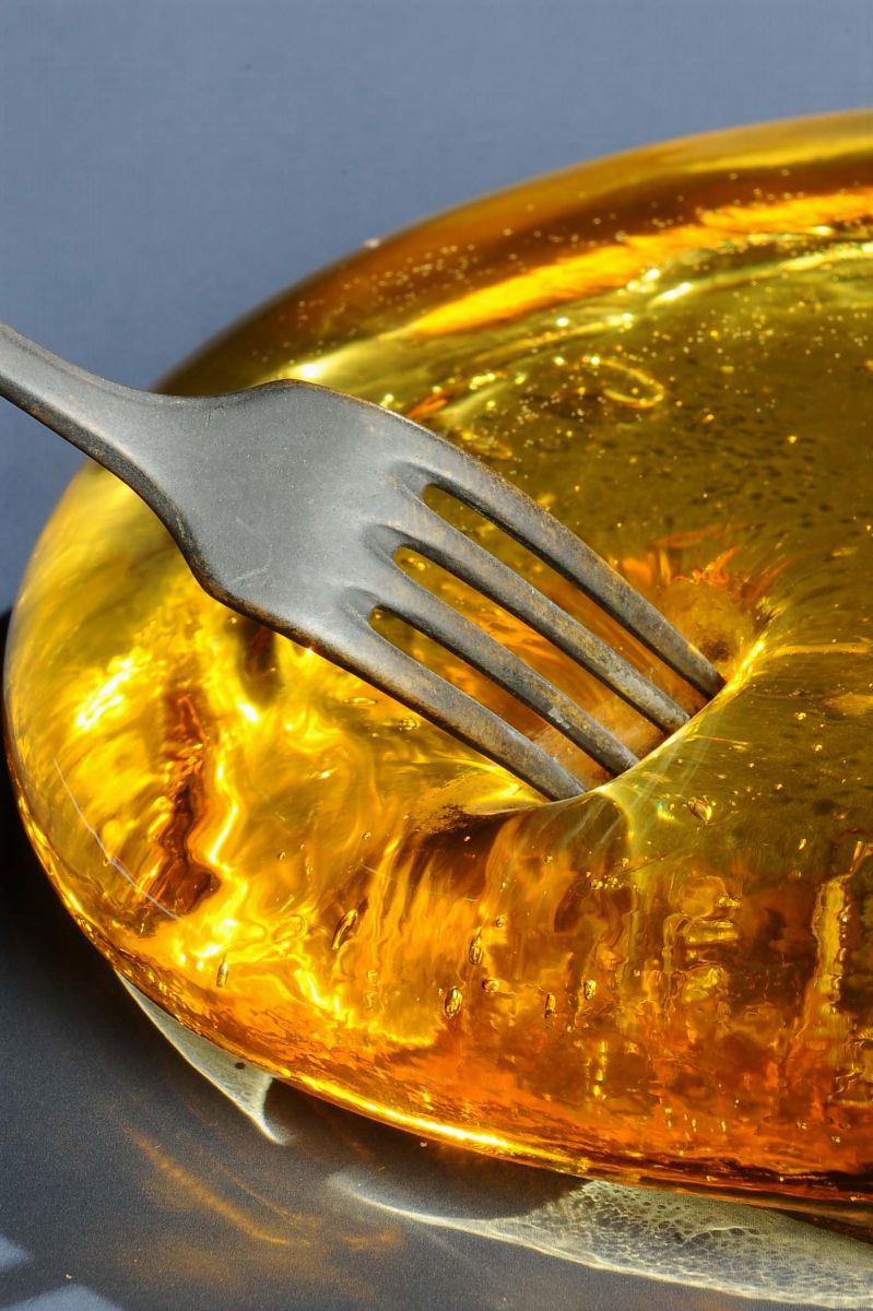 vetro giallo trasparente con forchetta inserita a caldo. 1964, diametro cm 20