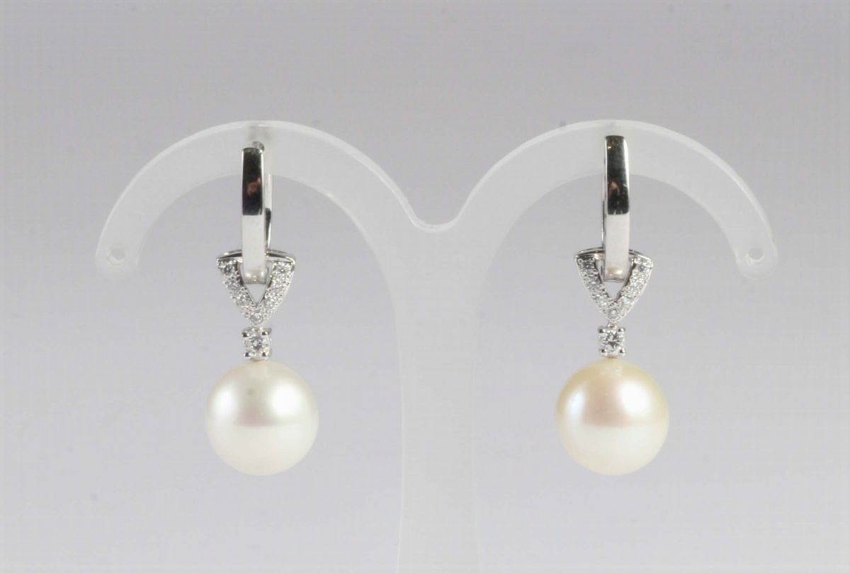montati in oro bianco. Diametro delle perle 11mm. Chiusura a perno