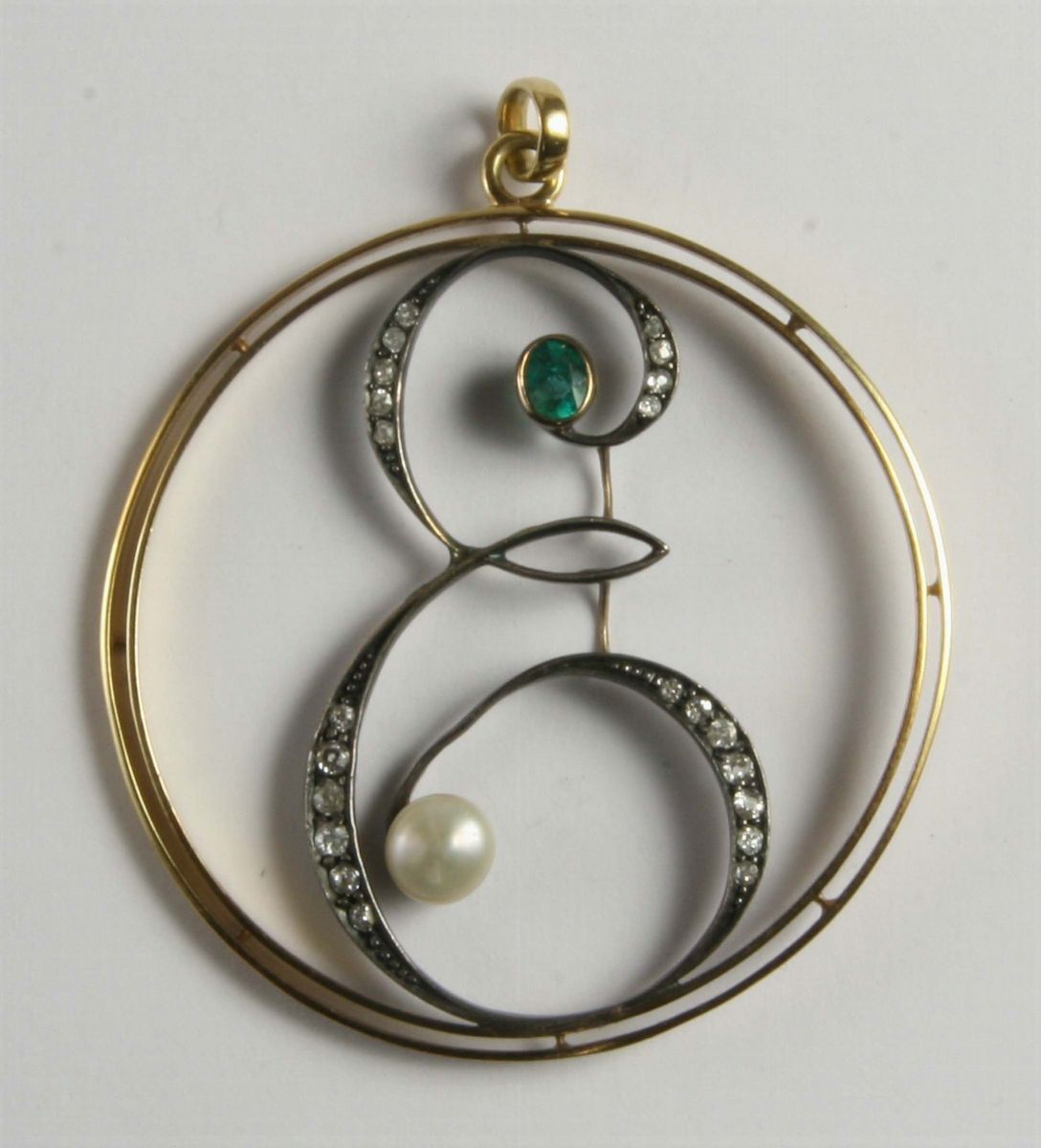 montatura in oro giallo decorato da una perla, uno smeraldo e diamanti taglio tondo