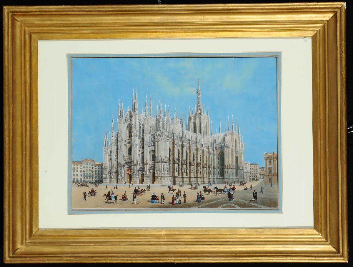 Acquatinta a colori raffigurante Duomo di Milano, XIX secolo