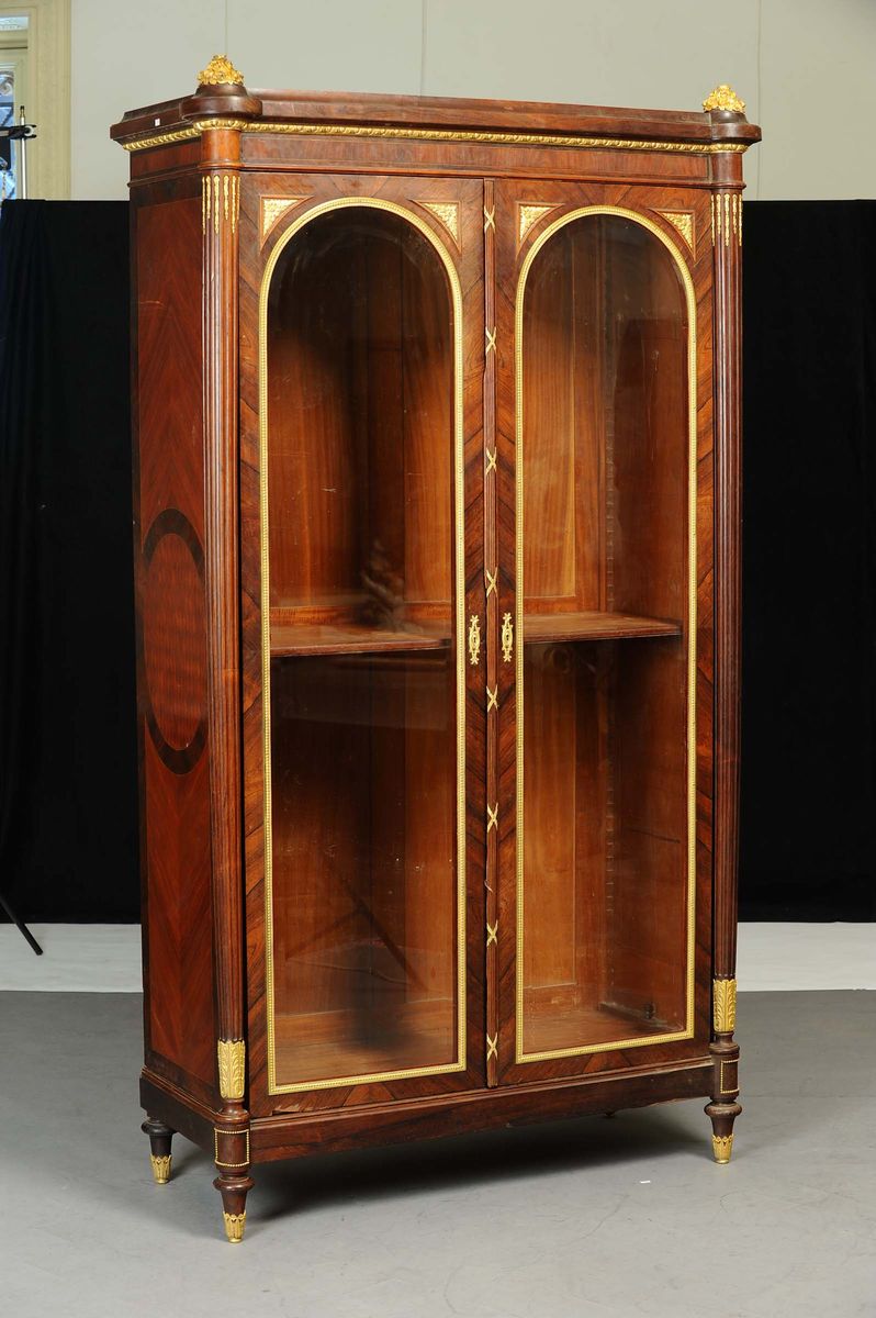 due ante intarsiate a motivo floreale, applicazioni di bronzi dorati, piano in marmo, cm 158x53x160