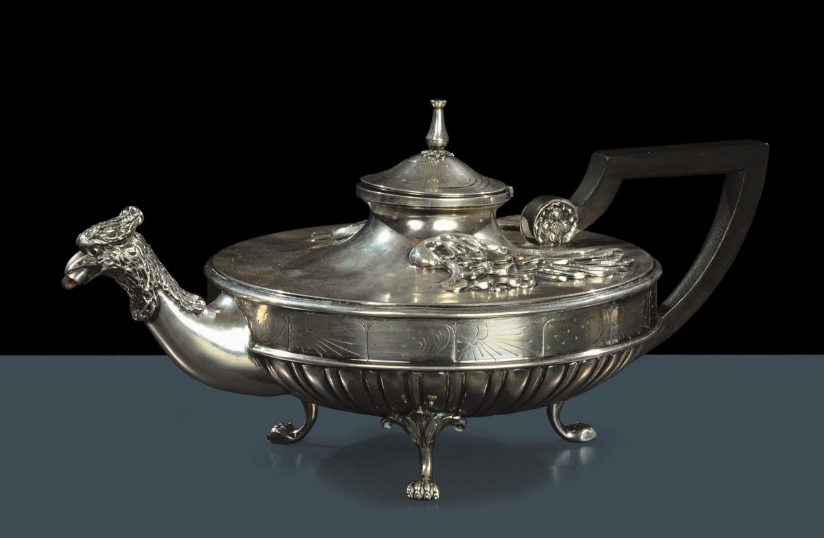 poggiante su tre piedi ferini, versatoio a testa di rapace, cm 33x19x13