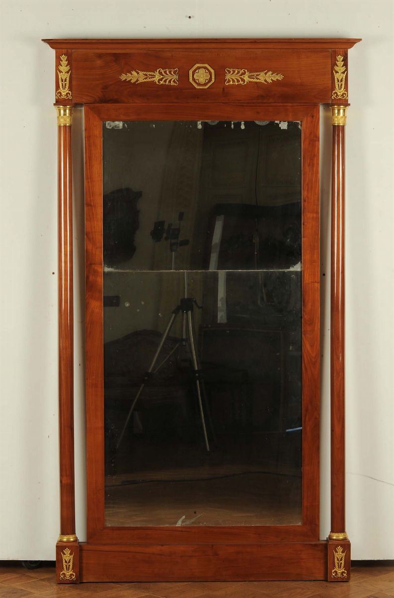 base con fondo a specchio e scanalature, montanti anteriori a foggia di cigni in bronzo dorato, piano in marmo, specchiera con montanti a colonne e applicazioni in bronzo dorato su fascia e colonne, cm 144x71x98, specchiera altezza cm 203